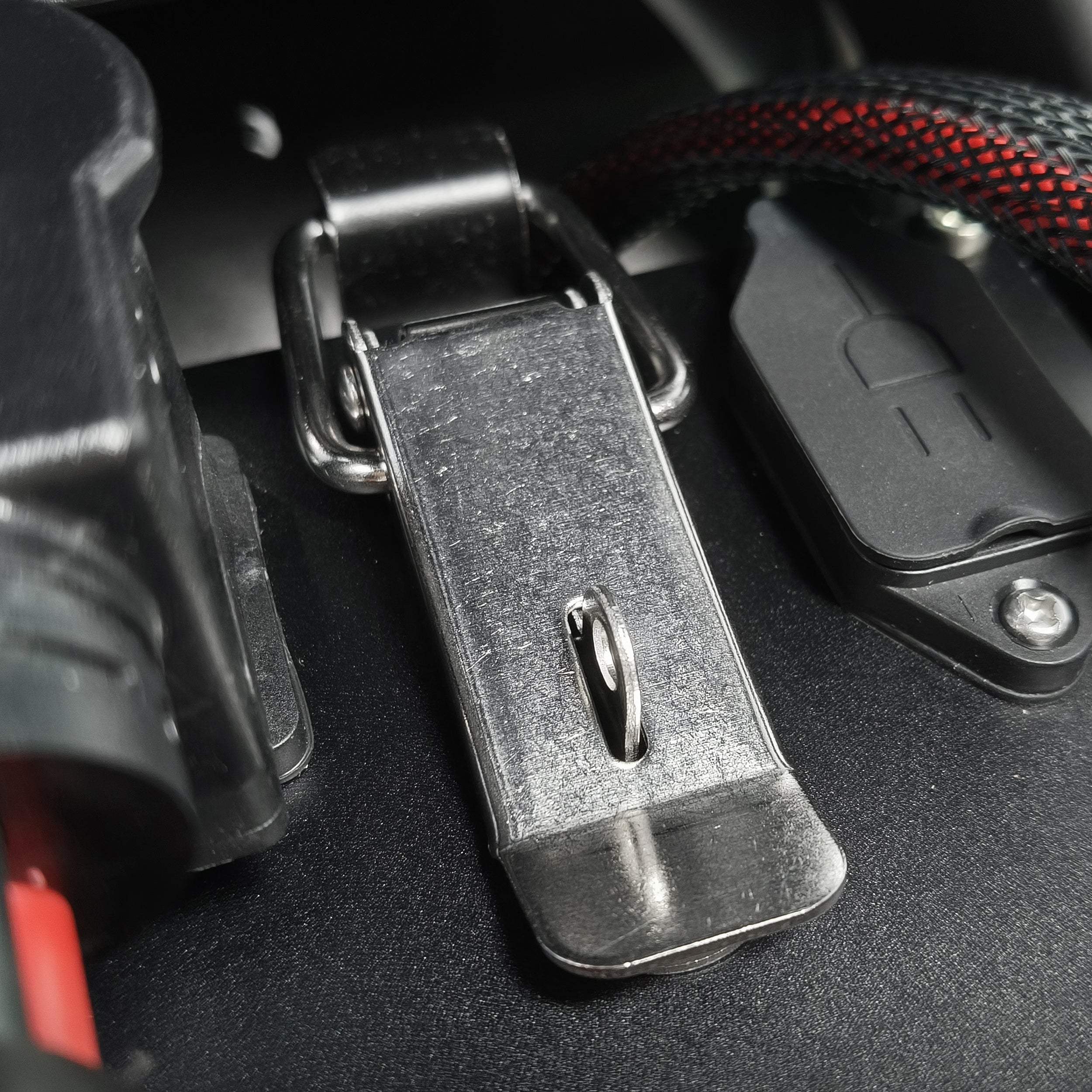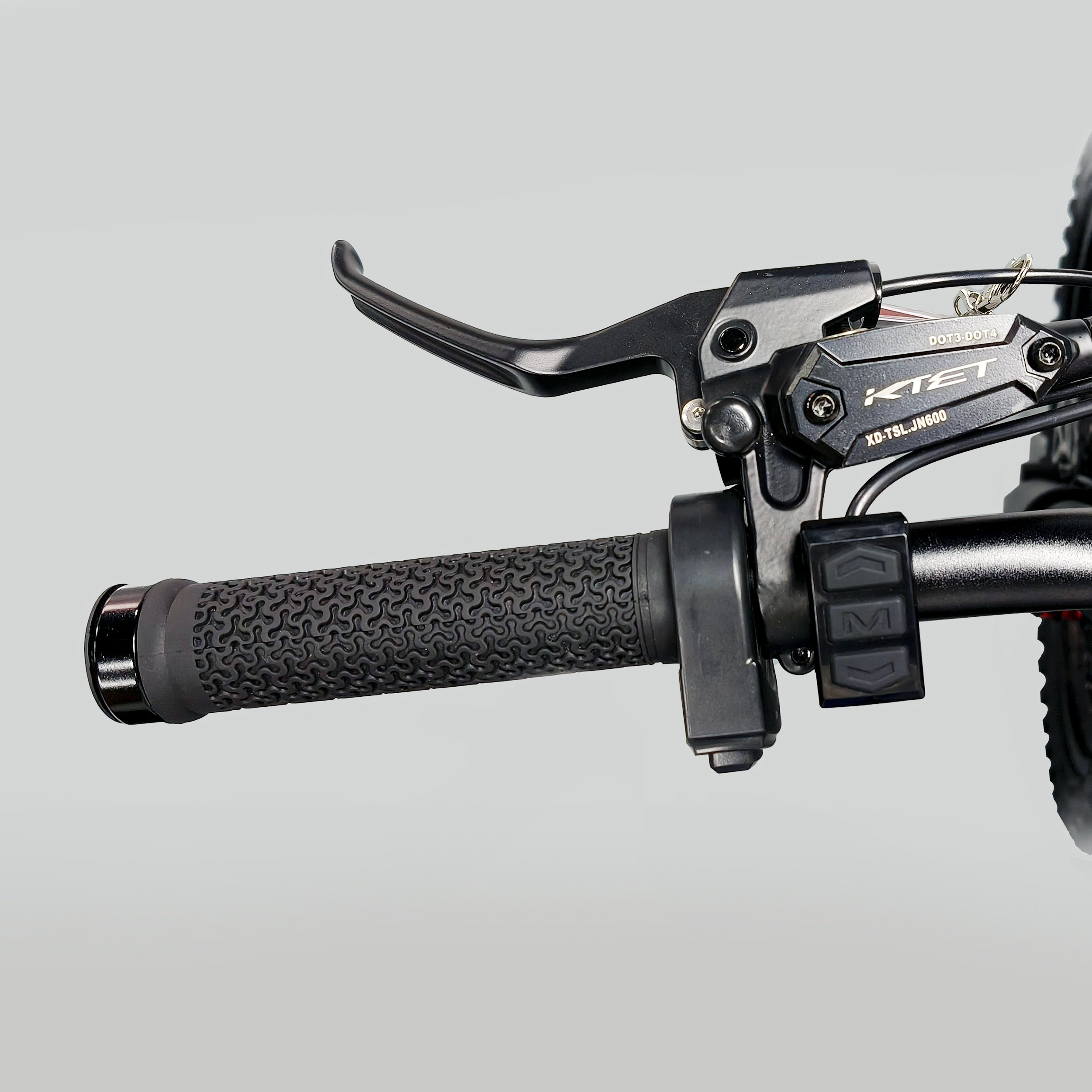 The front suspension comes with an inverted hydraulic fork offering 200mm of travel. Simply rotate the red knob on the right fork to adjust the oil pressure, which controls rebound speed. This allows you to set the suspension softer for comfort on rough terrain, or stiffer for stability at high speeds.